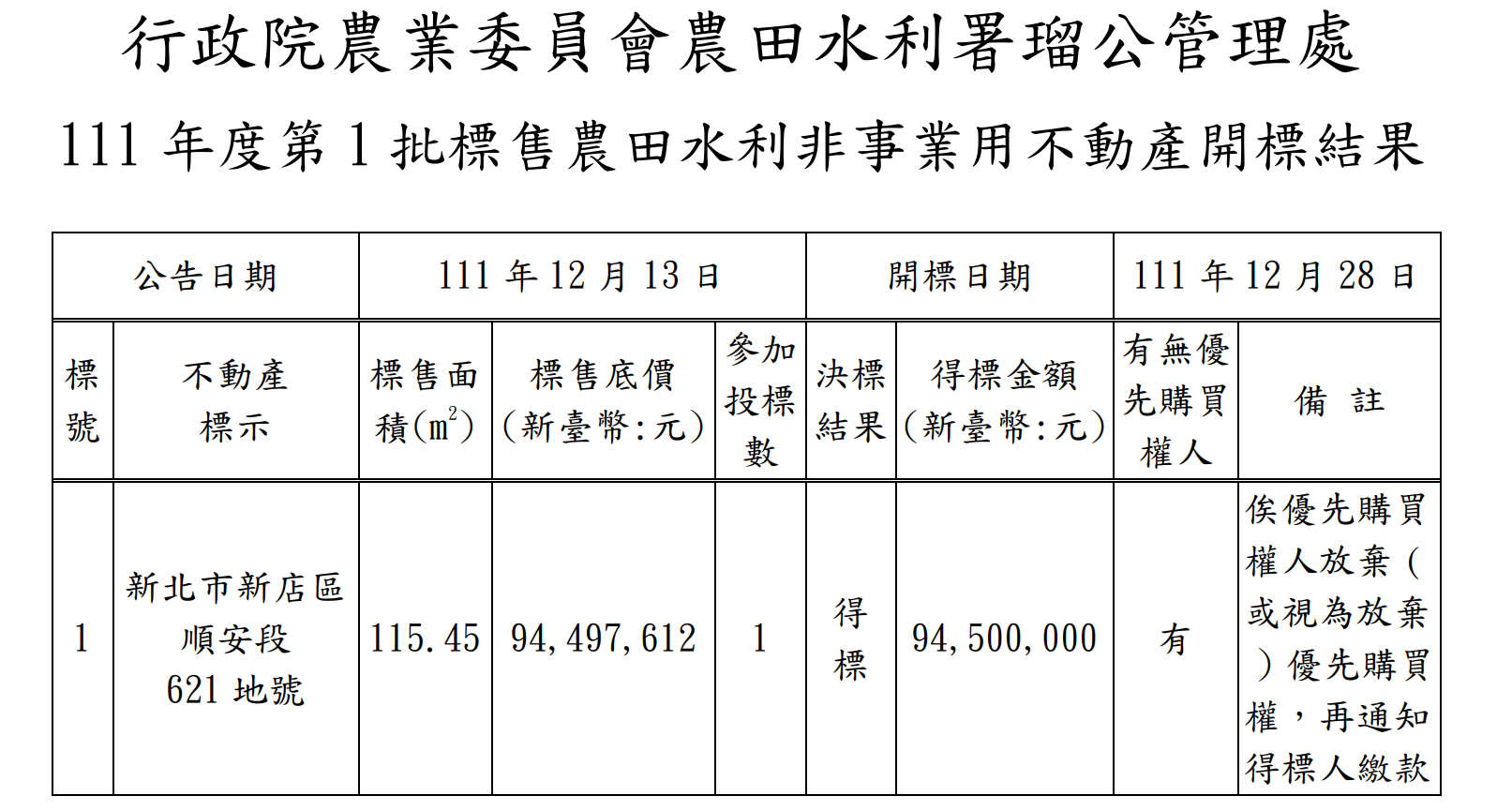 公告日期:111年12月13日 開標日期:111年12月28日 標號 不動產標示 標售面積(m2) 標售底價(新臺幣:元) 參加投標數 決標結果 得標金額(新臺幣:元) 有無優先購買權人 備註 1 新北市新店區順安段621地號 115.45 94,497,612 1 得 標 94,500,000 有 俟優先購買權人放棄 (或視為放棄) 優先購買權,再通知得標人繳款