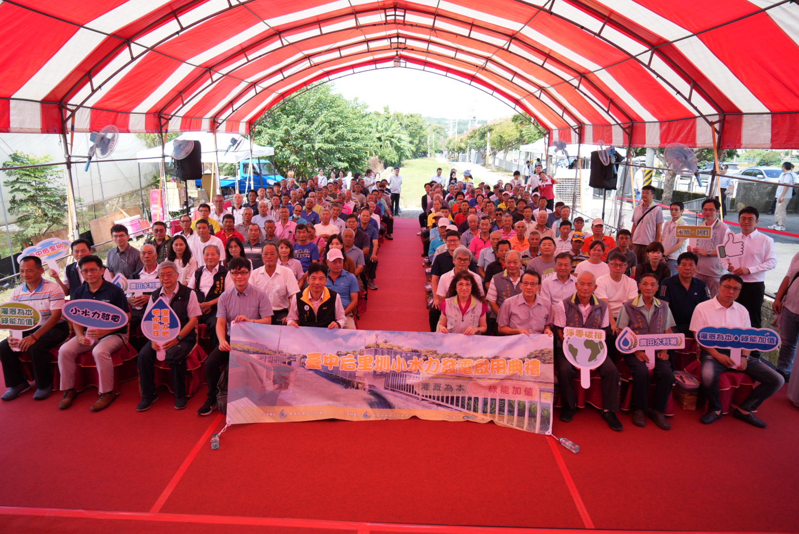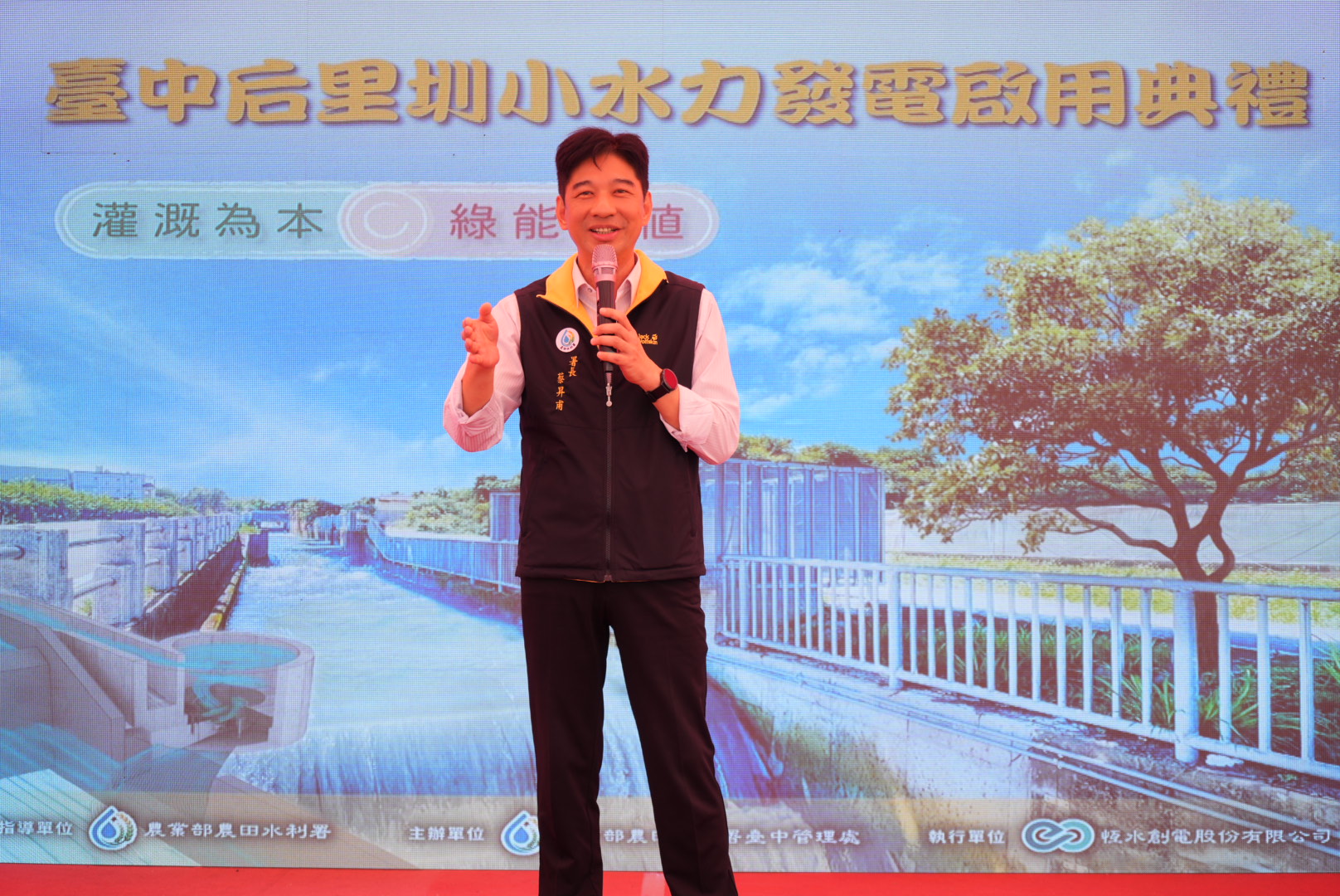 農業部農田水利署(以下簡稱農水署)配合國家再生能源及淨零碳排施政方針,積極推動運用圳路等農田水利設施建置小水力發電系統。農水署臺中管理處善用后里圳地勢及水流特性,成功建置完成后里圳小水力發電廠,並於今(30)日正式啟用。今日出席啟用典禮貴賓,計有農水署署長蔡昇甫、農水署臺中管理處處長王曼菁、經濟部能源署專門委員張群立、臺灣小水力綠能產業聯盟理事長洪正中、恆水創電股份有限公司執行長鄒飛逯、臺中市外埔區農會理事長廖進昌、常務監事黃國正、總幹事李錦東、臺中市后里區農會理事長劉萬祥、常務監事王添榮、總幹事陳清琪、農水署臺中管理處諮議委員陳榮福、高基讚、徐仲毅、温上琦、蕭進、劉進秤,地方人士及當地農民等,共同見證公私協力合作推動農田水利小水力發電成果。
