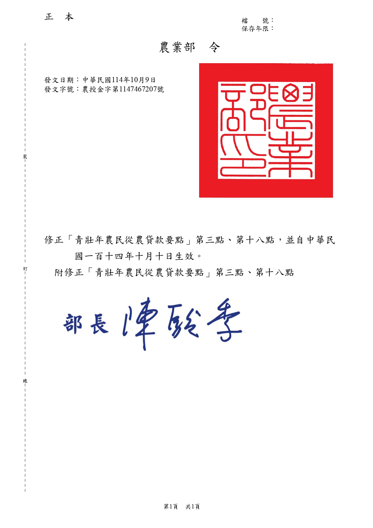 青壯年農民從農貸款要點第三點、第十八點修正規定 雜湊值驗證 青壯年農民從農貸款要點第三點、第十八點修正規定_26697_1369.pdf
