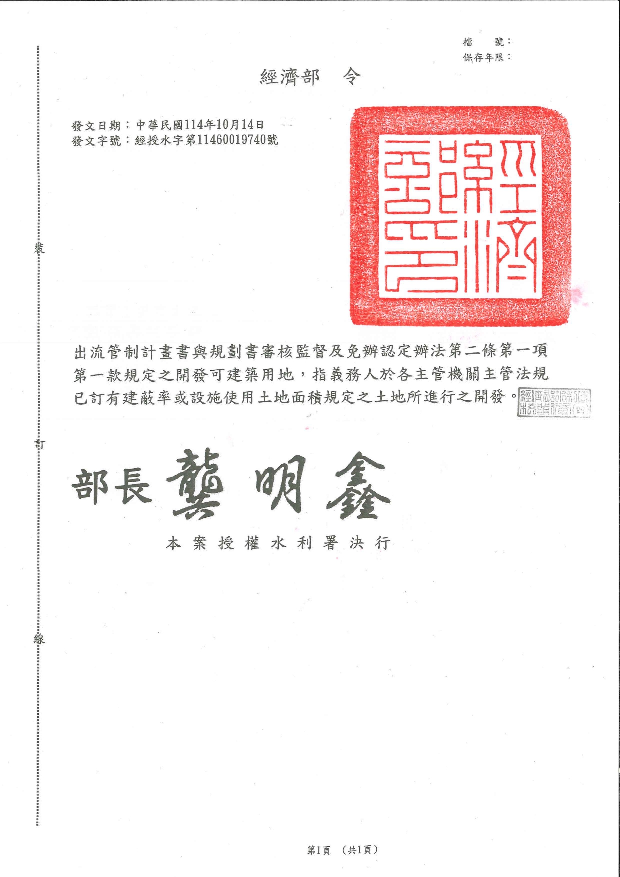 經濟部「出流管制計畫書與規劃書審核監督及免辦認定辦法」第2條第1項第1款規定解釋令