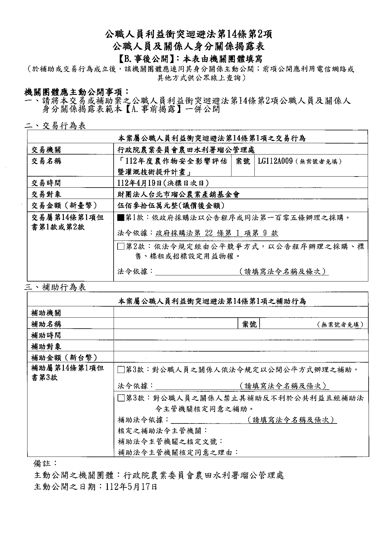 112年度農作物安全影響評估暨灌溉技術提升計畫-公職人員及關係人身分關係揭露表