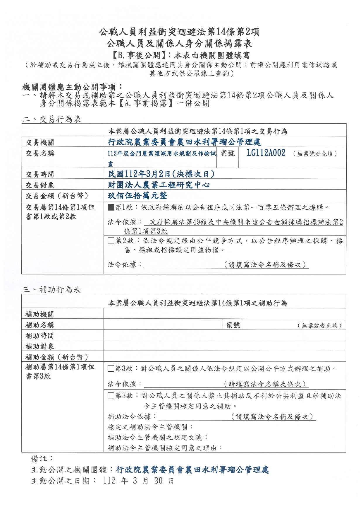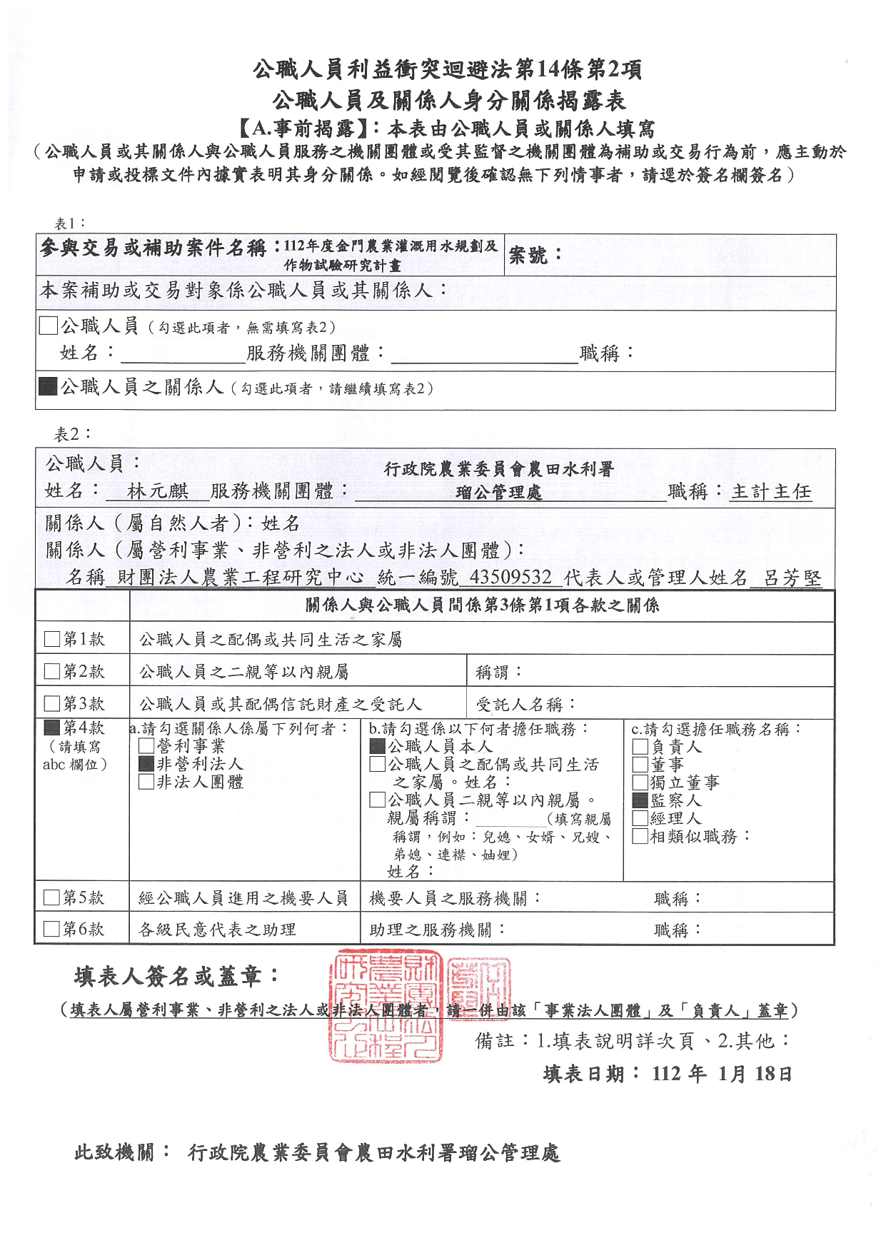 112年度金門農業灌溉用水規劃及作物試驗研究計畫-公職人員及關係人身分關係揭露表