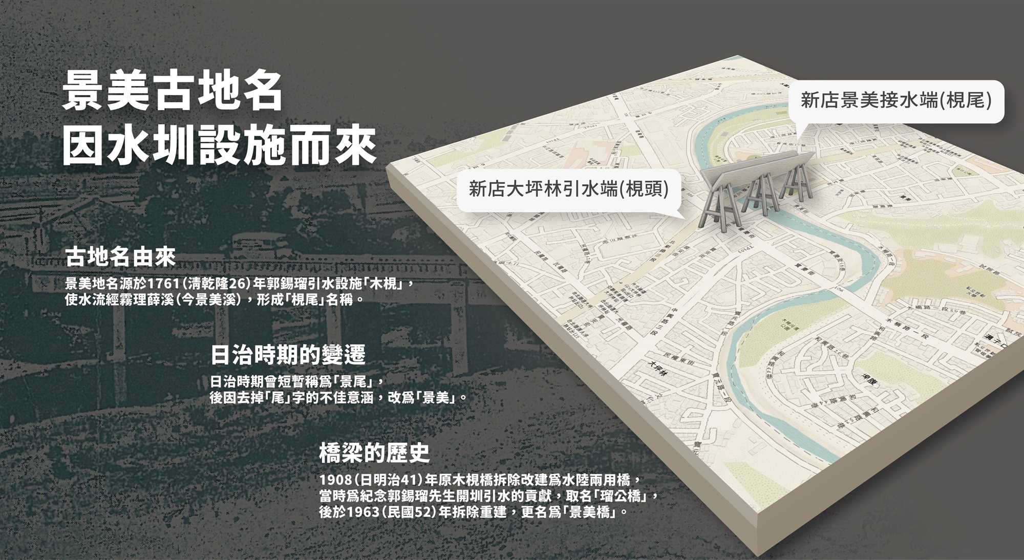 1761(清乾隆26)年郭錫瑠以「木梘」跨越霧理薛溪(今景美溪),將水源引至梘尾(今景美街)。木梘為一座水路橋,以木樁和木板構成ㄩ型槽,架跨於溪河之上,讓灌溉用水通過。當時人們將新店大坪林引水端稱為「梘頭」,過景美溪因為木梘的尾端,而稱為「梘尾」。