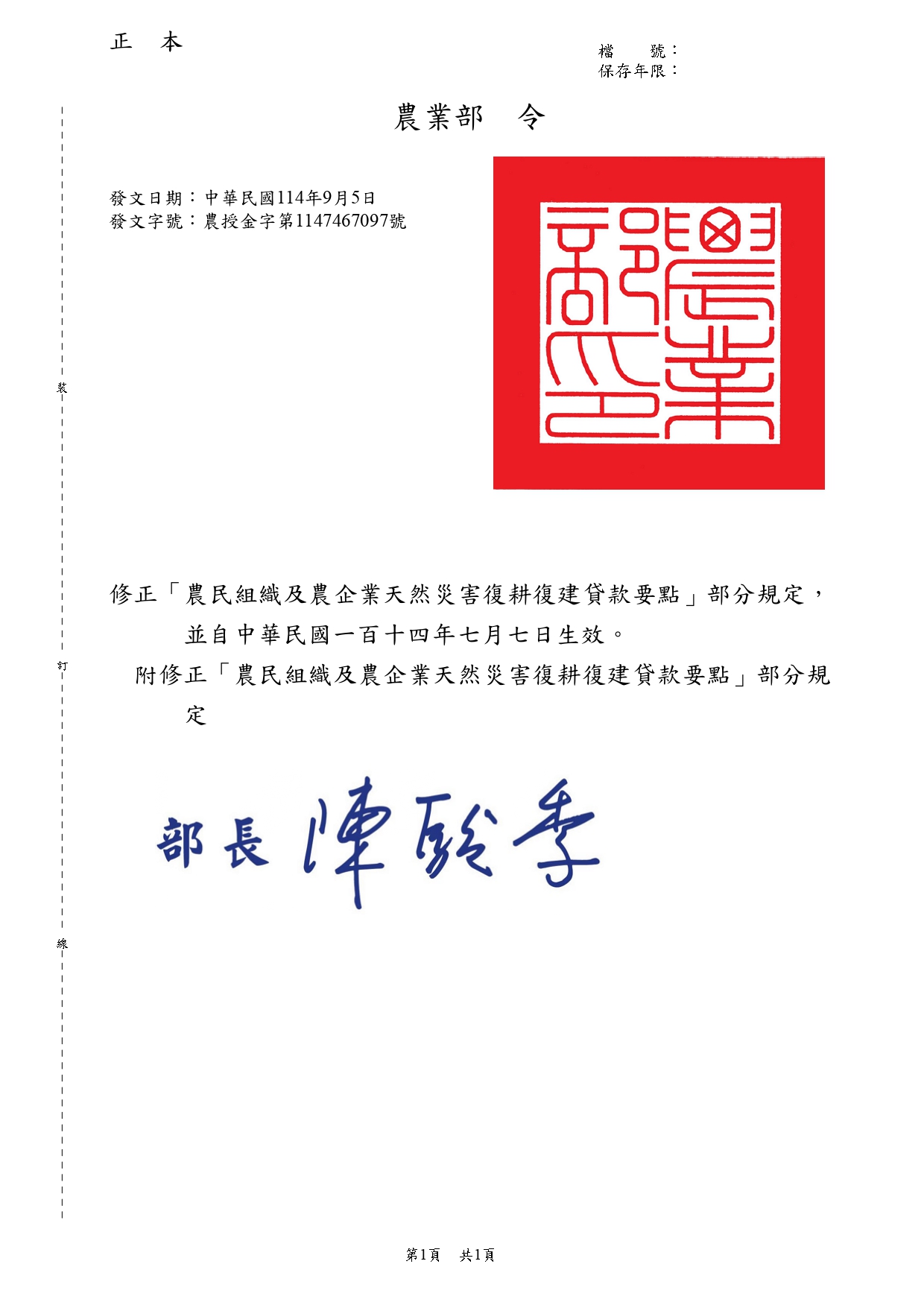 「農民組織及農企業天然災害復耕復建貸款要點」部分修正規定 雜湊值驗證 「農民組織及農企業天然災害復耕復建貸款要點」部分修正規定_26256_5927.pdf