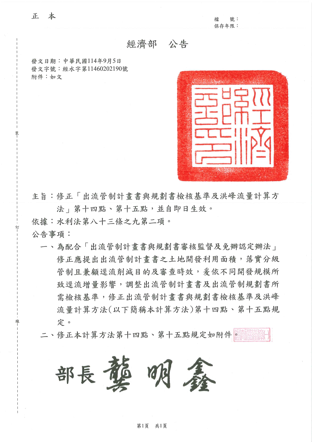 經濟部「出流管制計畫書與規劃書檢核基準及洪峰流量計算方法」第14點及第15點修正