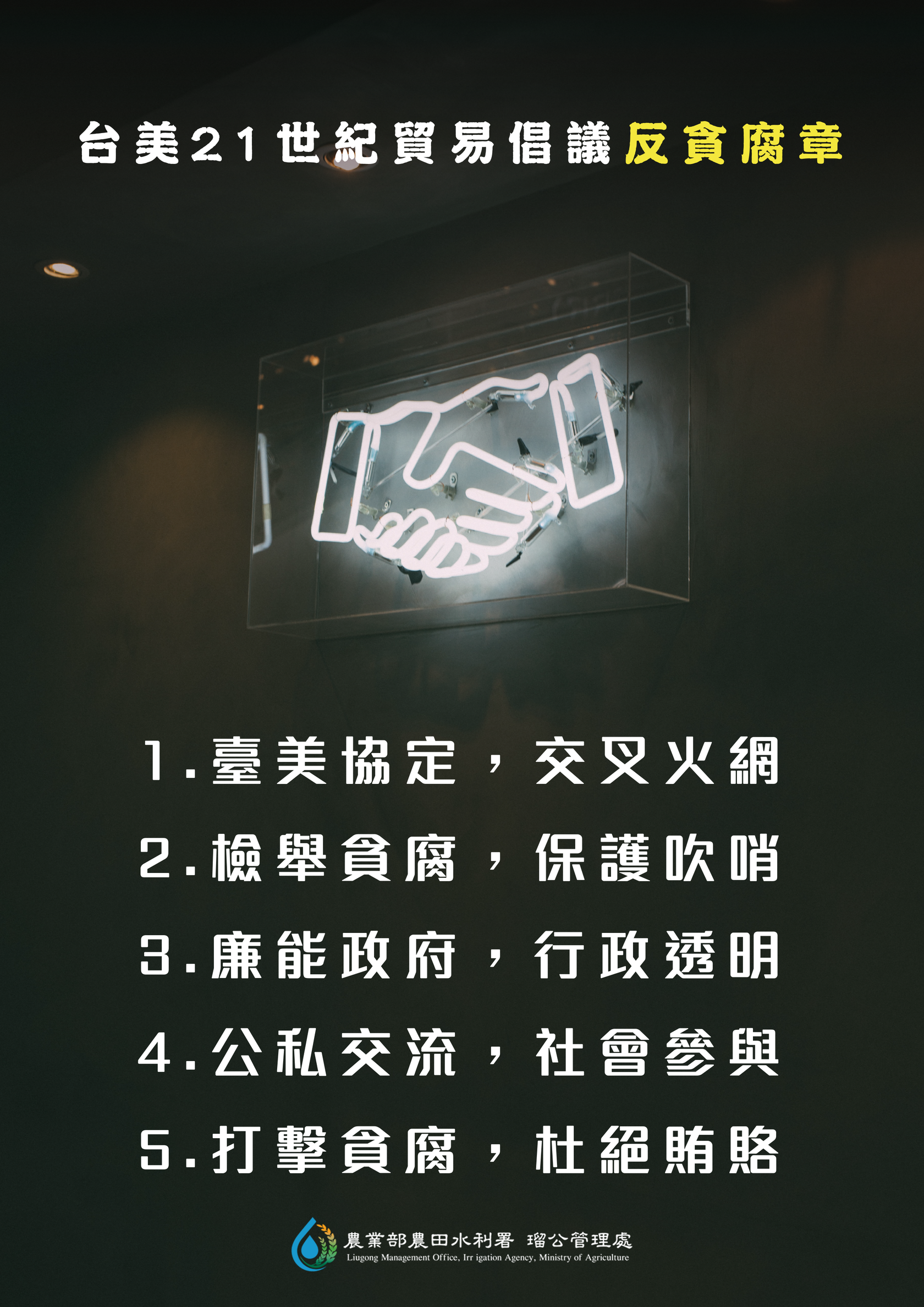 行政院公布「臺美21世紀貿易倡議」第一階段談判內容,首次納入「反貪腐」議題,未來臺美雙方將共同合作打擊貪腐。 相關背景議題說明及後續動態,請參考「臺美倡議反貪腐議題說明」及廉政署「臺美21世紀貿易倡議專區」。