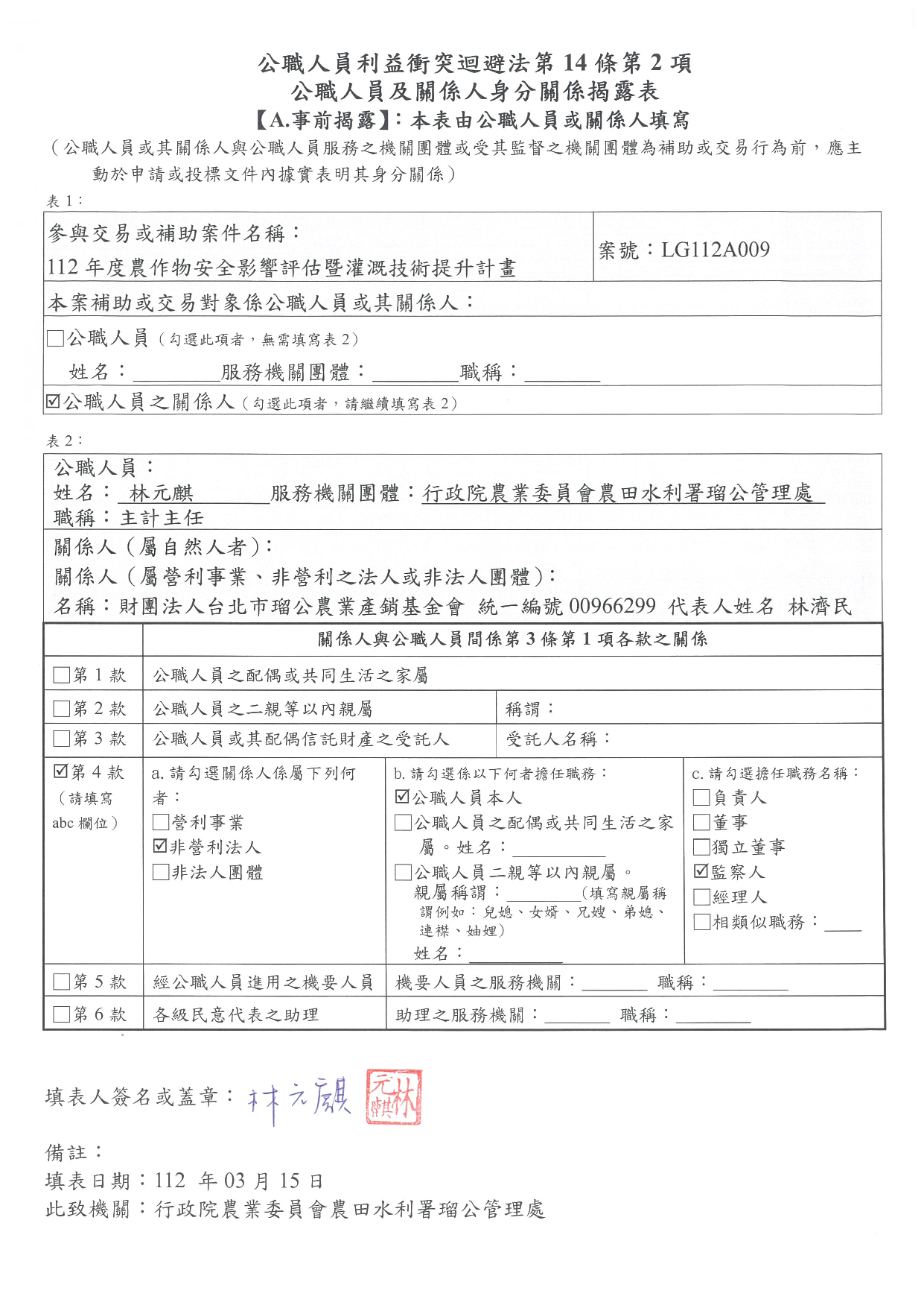 112年度農作物安全影響評估暨灌溉技術提升計畫-公職人員及關係人身分關係揭露表